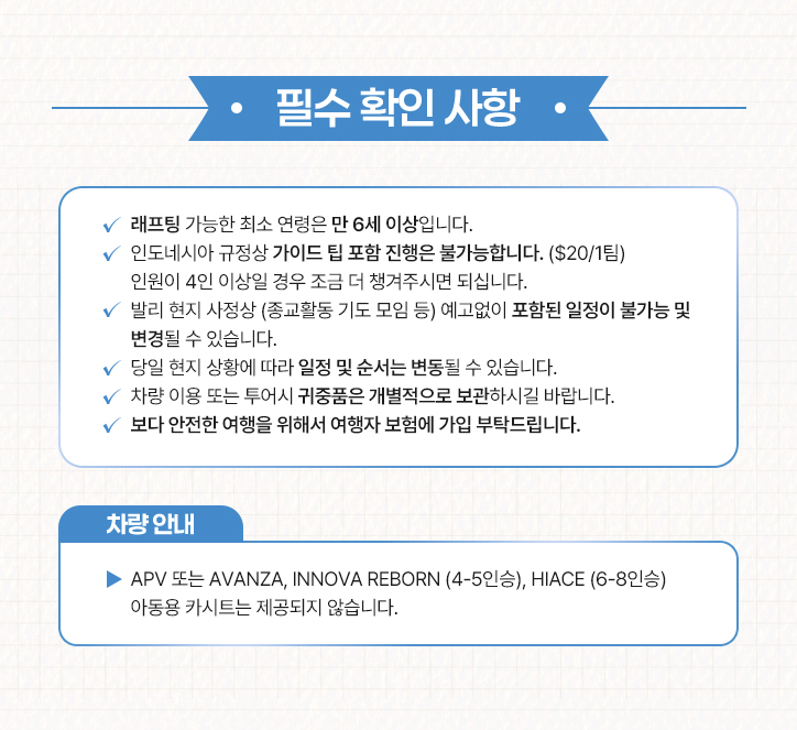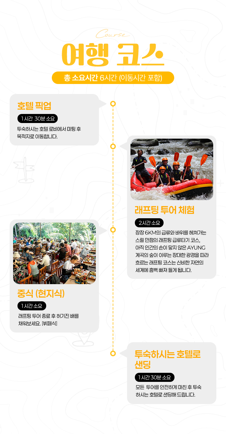 - 약 6km의 래프팅이 진행되며, 래프팅 시간은 약 2시간 정도 소요됩니다.