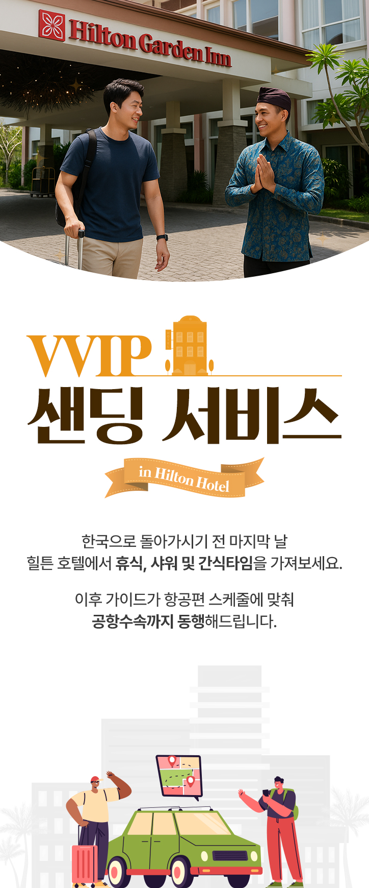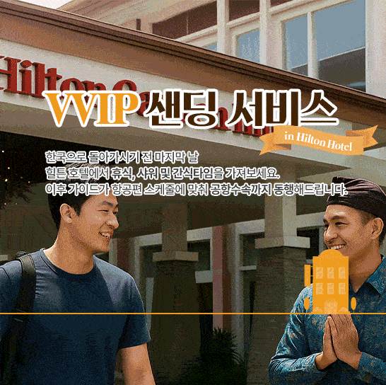 한국으로 돌아가시기 전 마지막 날 힐튼 호텔에서 휴식, 샤워 및 간식타임을 가져보세요. 이후 가이드가 항공편 스케줄에 맞춰 공항 수속까지 동행해드립니다.