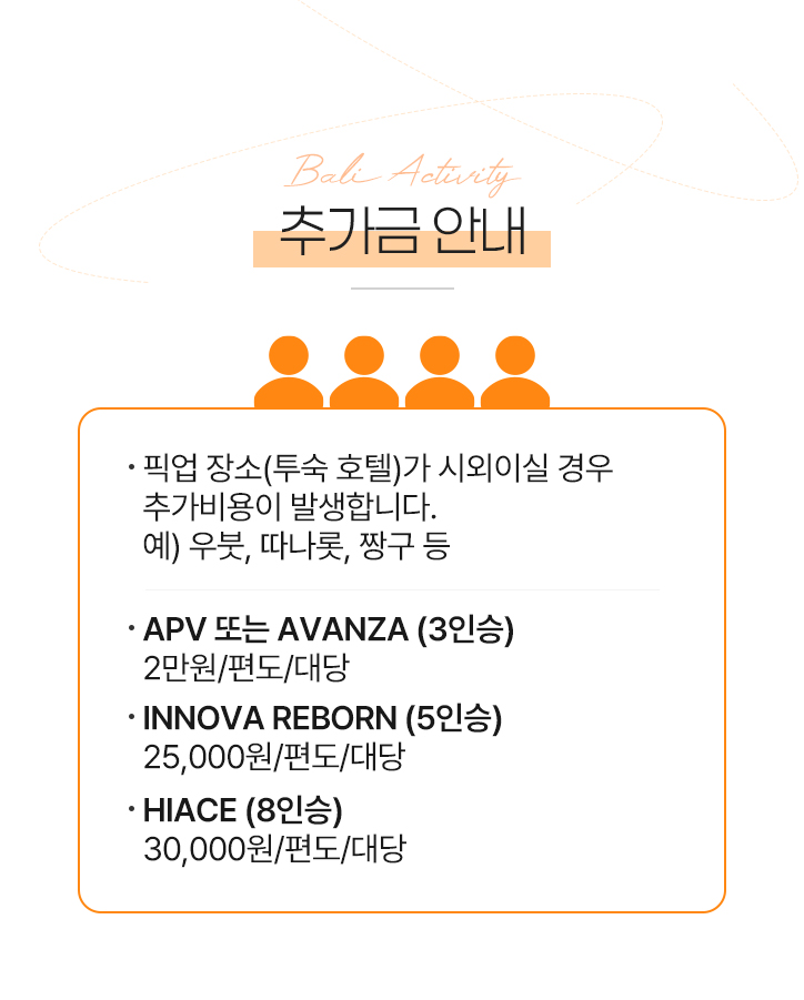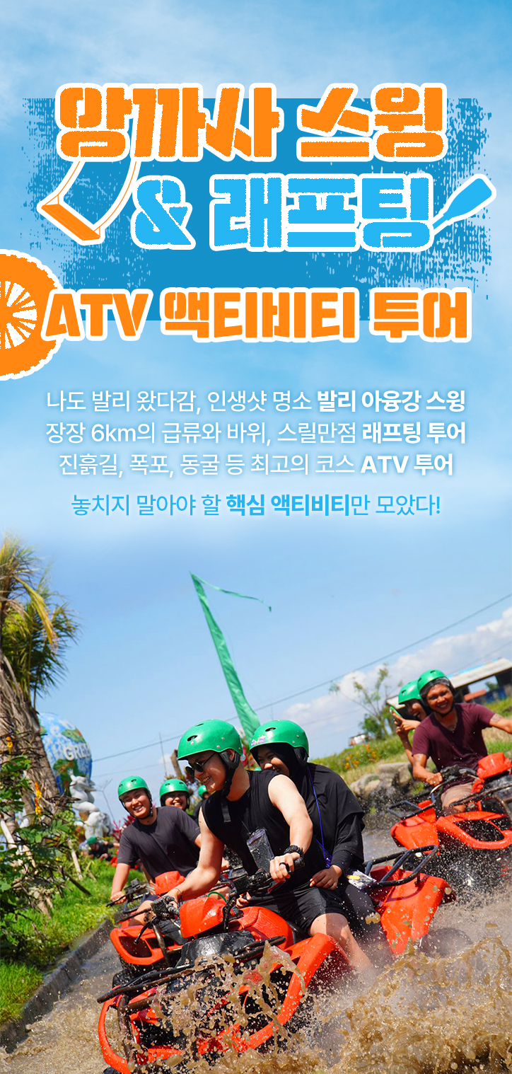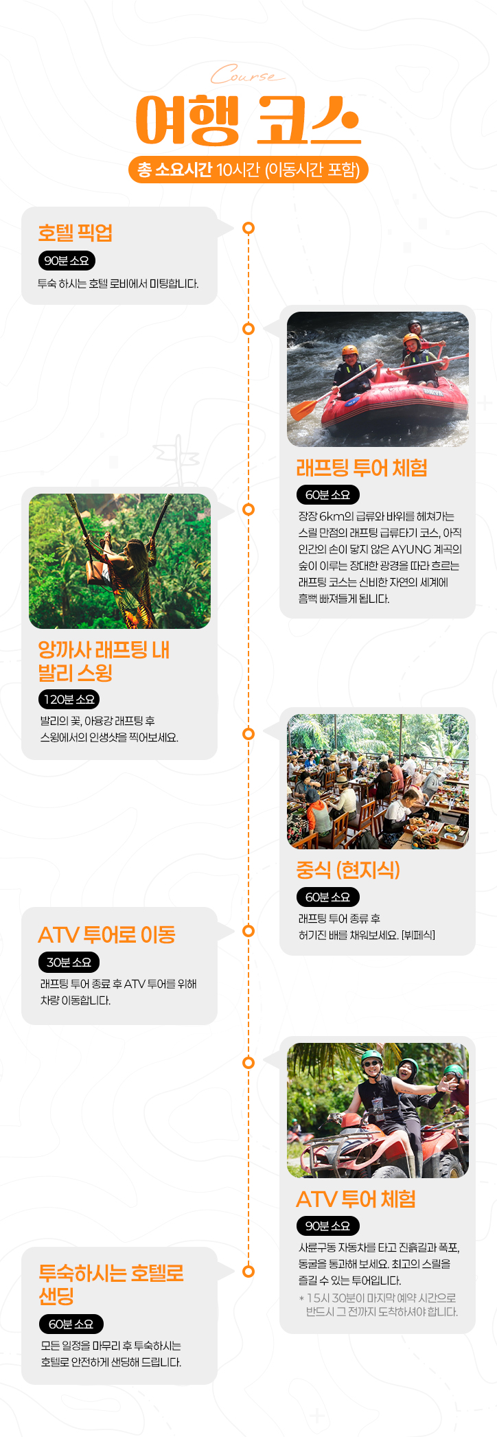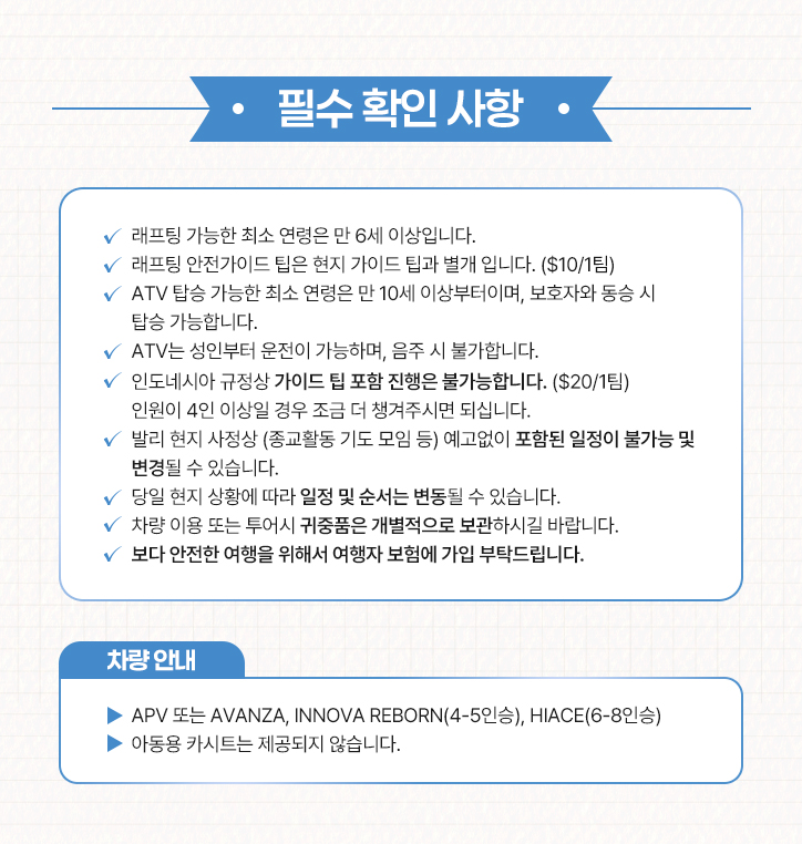 - ATV는 약 1시간 30분 소요되며, 오후 3시 30분이 마지막 예약 시간으로 반드시 그 전까지 도착하셔야 합니다.