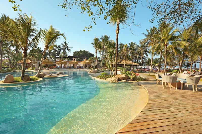 **발리 만디라 비치 리조트 (Bali Mandira Beach Resort & Spa)는 발리 르기안 해변 바로 앞에 위치한 리조트로 4개의 야외 수영장(어린이용 포함)과 워터슬라이드, 스파, 피트니스 센터, 키즈 클럽 등 다양한 부대시설을 갖추고 있으며 해변과 가까운 위치로 아름다운 석양을 감상할 수 있는 리조트입니다.