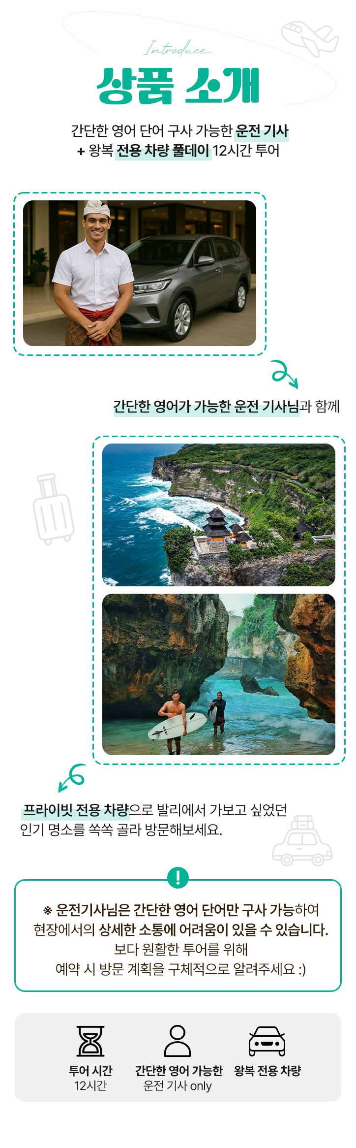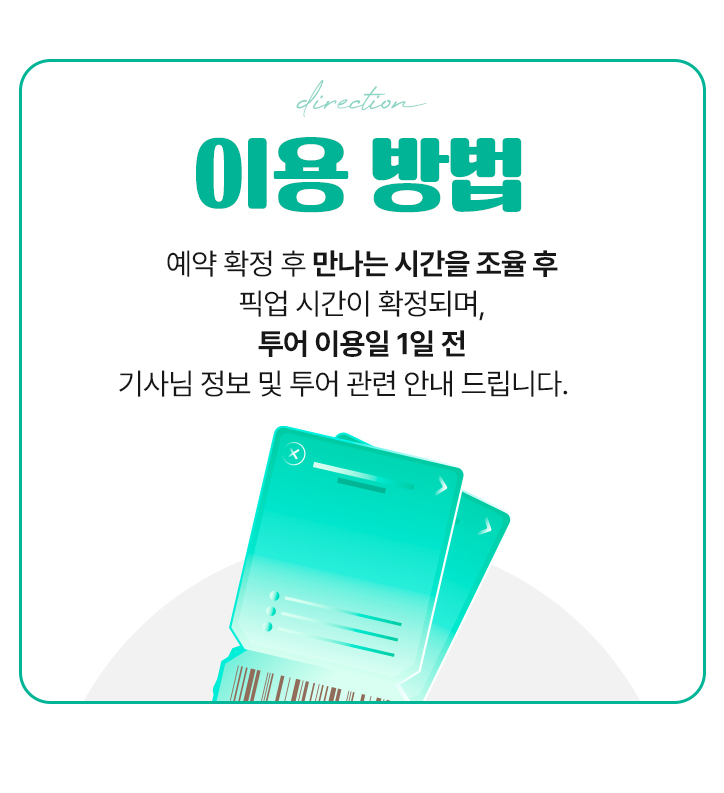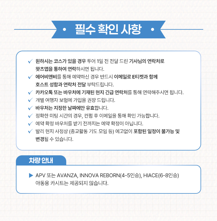 - 운전 기사님은 간단한 영어 단어만 구사 가능하여 현장에서의 상세한 소통에 어려움이 있을 수 있습니다.