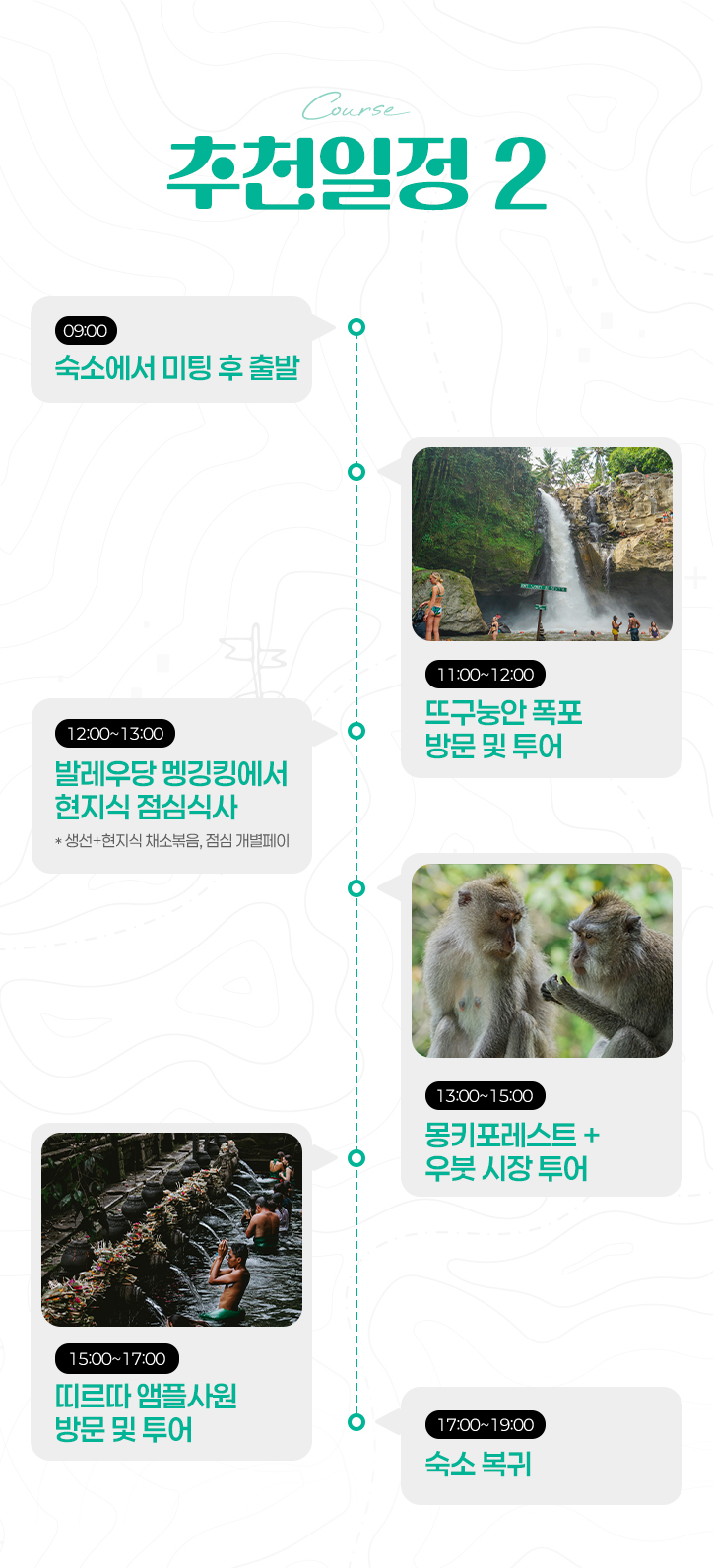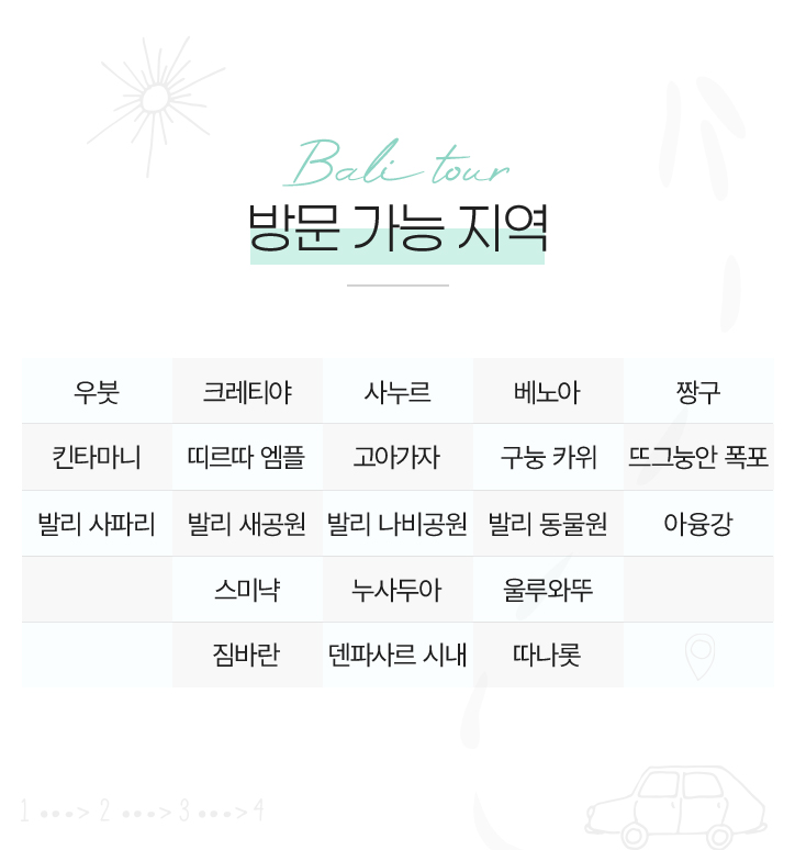 - 간단한 영어가 가능한 운전 기사님과 함께 프라이빗 전용 차량으로 발리에서 가보고 싶었던 인기 명소를 쏙쏙 골라 방문해보세요.