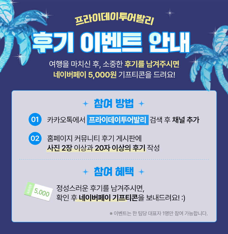 홈페이지 예약 접수 후 카카오 채널 ‘프라이데이투어 발리’를 추가해주시고, 예약자 성함을 남겨주세요.