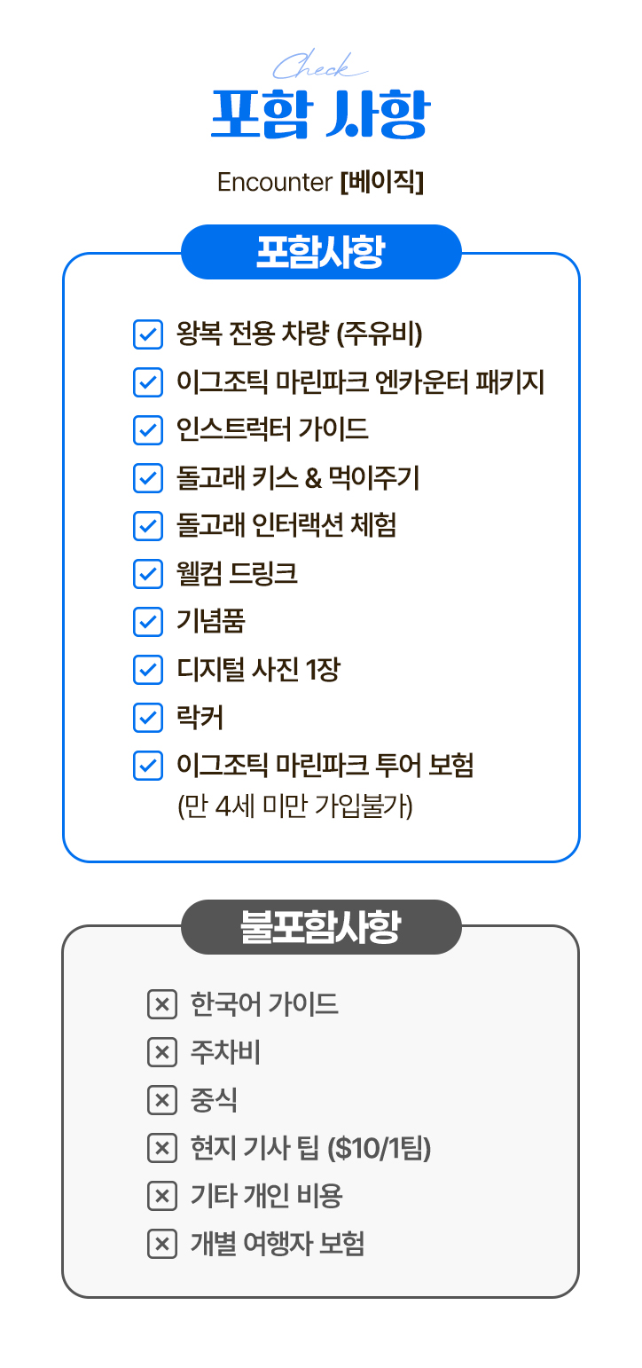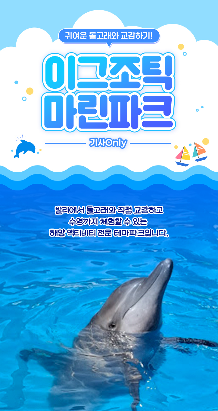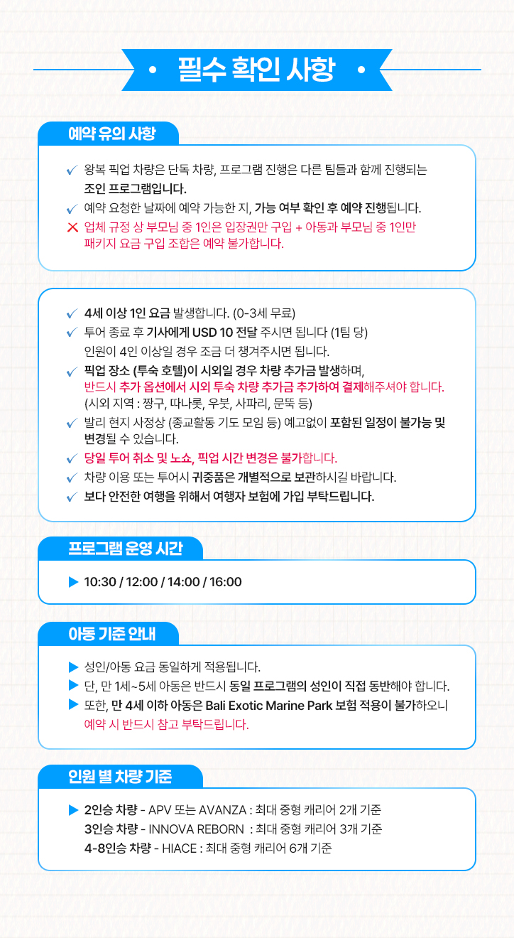 - 또한, 만 4세 이하 아동은 Bali Exotic Marine Park 보험 적용이 불가하오니 예약 시 반드시 참고 부탁드립니다.