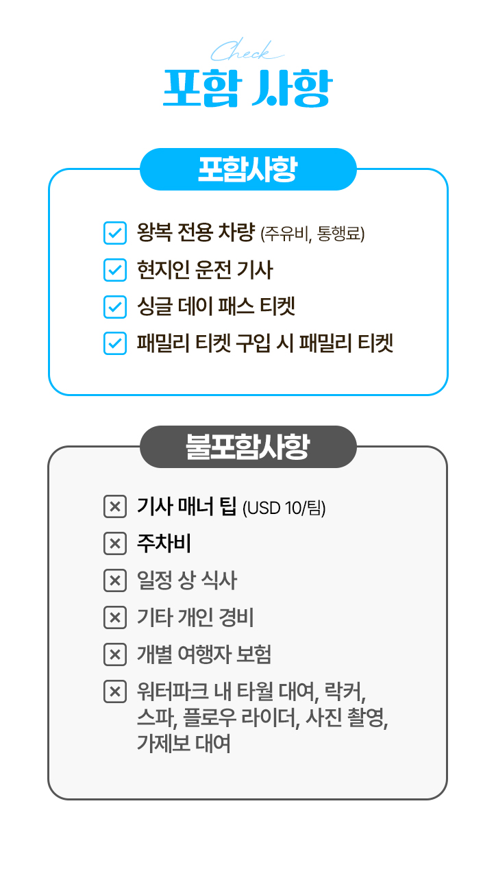 ❌ 불포함 : 타월 대여, 락커, 스파, 플로우 라이더, 사진 촬영, 가제보 대여, 워터파크 내 식사 비용, 여행자 보험, 주차비 불포함입니다.