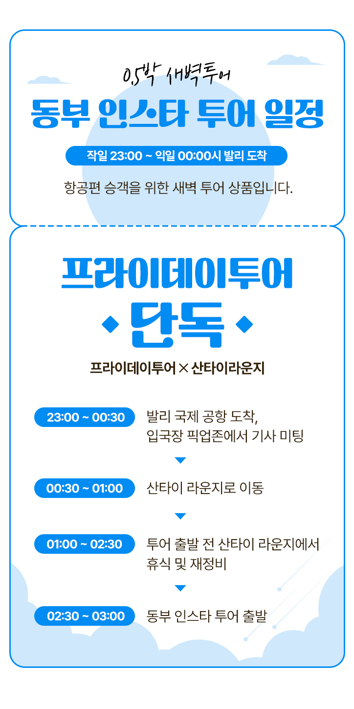 작일 23:00 ~ 익일 00:00시 발리 도착 항공편 승객을 위한 새벽 투어 상품입니다.